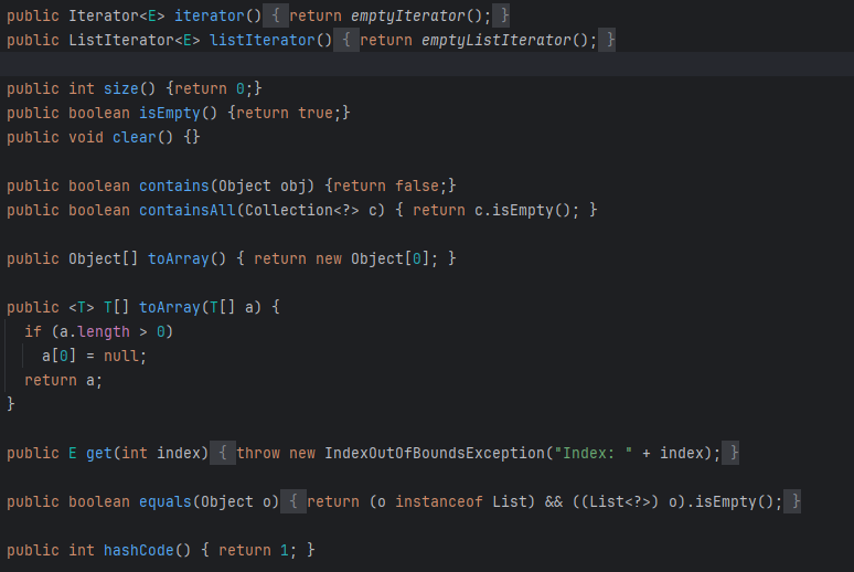 EmptyList의 경우 get() 호출 시, IndexOutOfBoundsException을 터트리고, size( )는 0을 반환하고, isEmpty( ) 메소드 또한 true인것을 확인할 수 있다. 즉 완전히 빈 리스트를 정의하는 특징들을 갖고 있다.