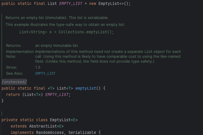 EmptyList라는 클래스가 별도로 존재했고, 이를 List<T>타입으로 캐스팅해 반환해 주고 있었다.