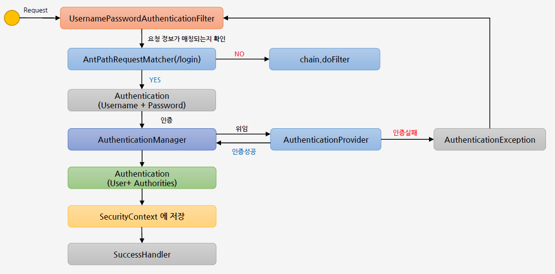 1. 사용자가 인증을 시도하면 UsernamePassWordAuthenticationFilter가 이를 처리