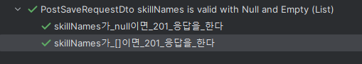 위 코드는 List<String> 인 skillNames인 해시태그 입력 란에, List가 null 이거나 empty 일 경우의 테스트 성공여부를 알아보기 위해 작성한 테스트 코드이다. 물론 위 방법도 돌아가는데 문제는 없지만 테스트코드가 길어지고 지저분해 보였다.