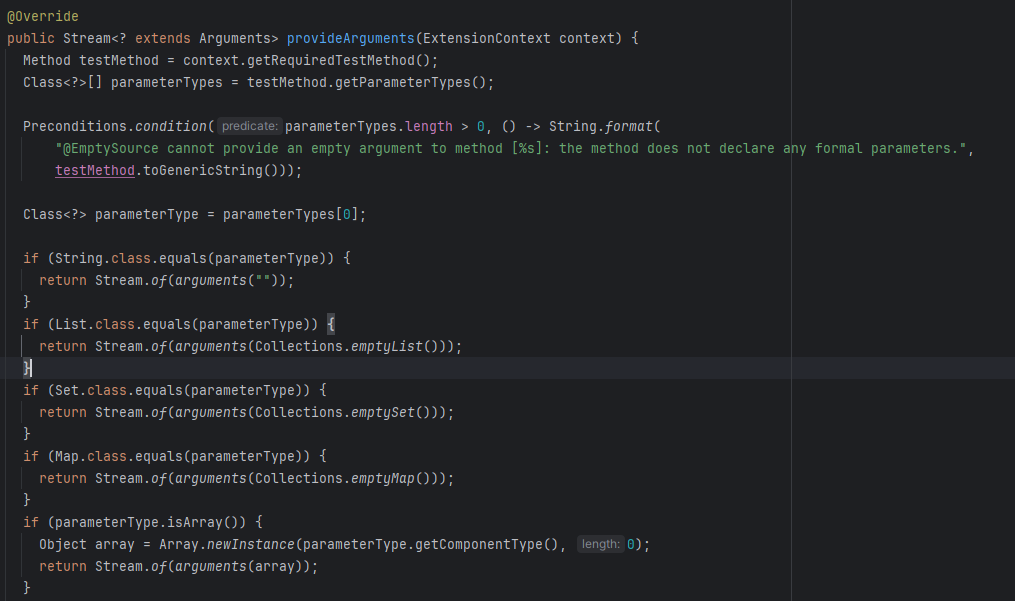 그래서 String 타입 테스트시 사용했던 @NullAndEmptySource가 String 타입인 List에도 쓸 수 있나 해서 코드를 타고 들어가봤다.