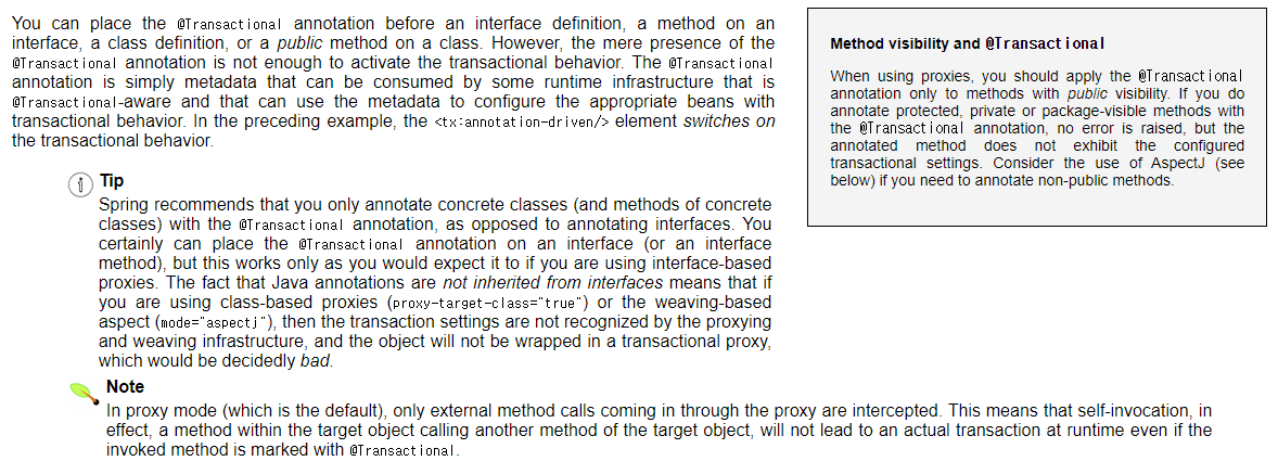 @Transactional 주석으로 구체적인 클래스 (및 구체적인 클래스의 메서드)에만 주석을 달도록 권장합니다. 인터페이스 (또는 인터페이스 메소드)에 @Transactional 어노테이션을 배치 할 수 있지만 이는 인터페이스 기반 프록시를 사용하는 경우 예상 한 대로만 작동합니다.