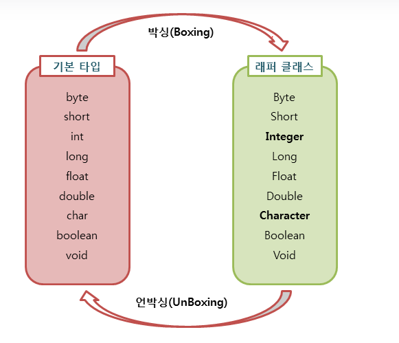 - Boxing : 기본 타입의 데이터 → 래퍼 클래스의 인스턴스로 변환