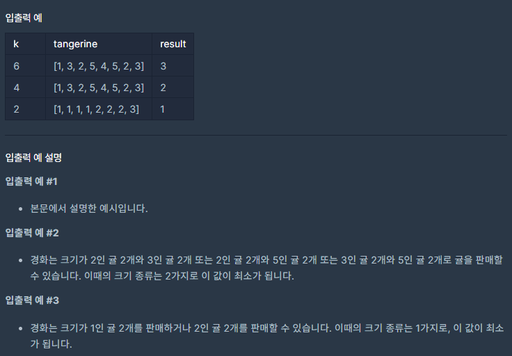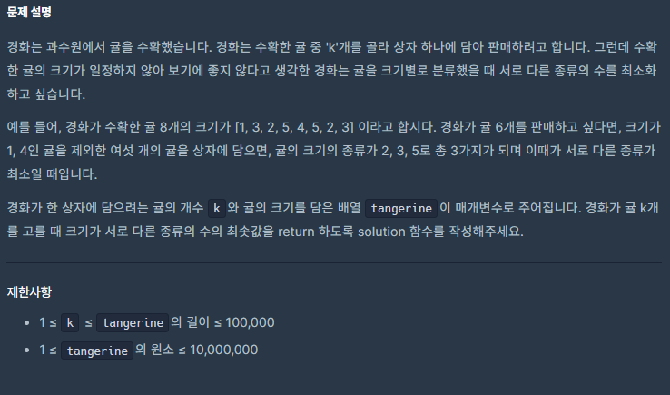 (한 종류가 많은 개수의 귤을 사용해야 귤의 종류를 적게 사용할 수 있기 때문이다.). --> 중요!!!