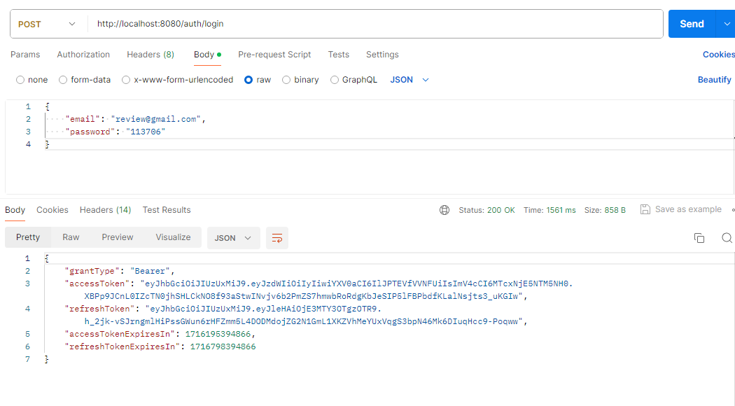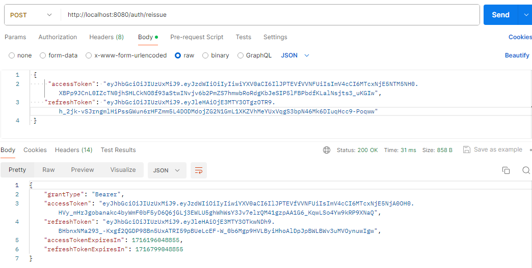4. 2~3번 과정에서 발급 받은 Access-Token과 Refresh_Token 값을 Body에 담아 토큰 재발급(reissue) API로 보내보자.