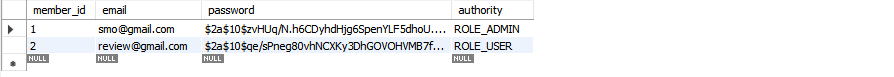 1. "email"과 "password"를 입력하고 회원가입을 하면 MySQL DB에 회원 정보가 저장된 것을 확인할 수 있다.