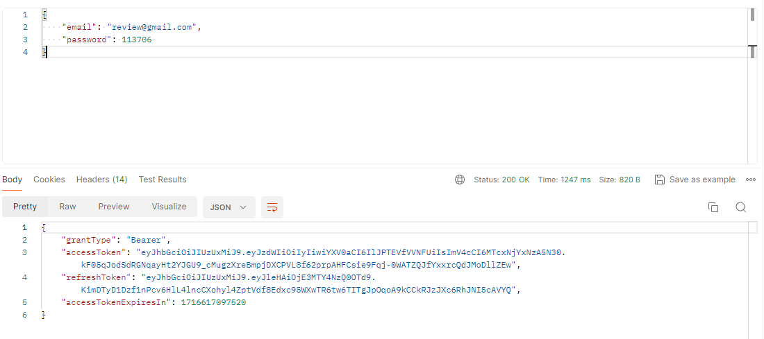 PostMan으로 EC2상의 배포한 주소로 Login 요청을 보내면 위와 같이 AccessToken과 RefreshToken이 발급된다.